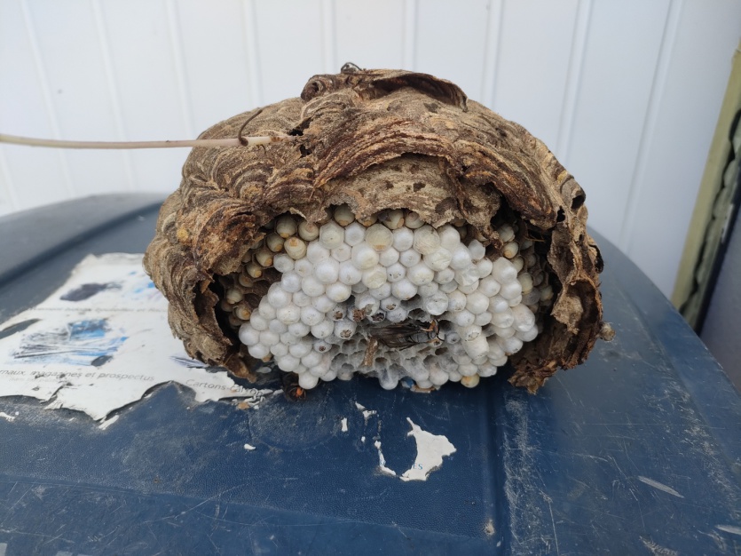 Découvert chez Daniel Gimpel dans un bac à fleurs, ce nid primaire de frelons asiatiques a été retiré et placé 24 h dans un congélateur par Patrick Antony dans le but de le détruire.