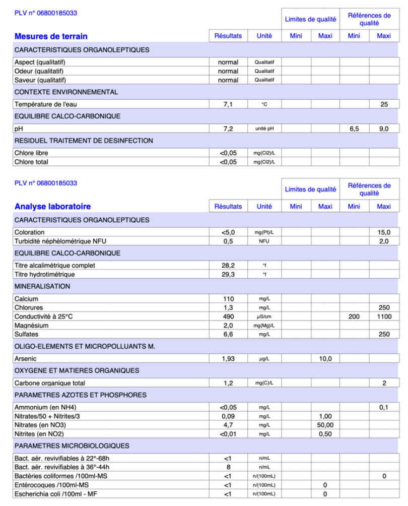 Résultats d'analyses d'eau du contrôle sanitaire de l'eau