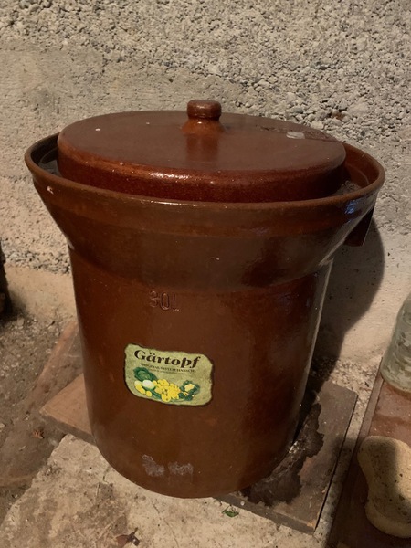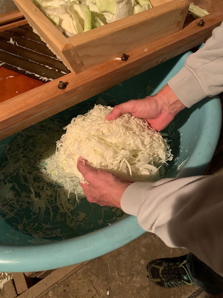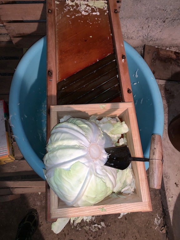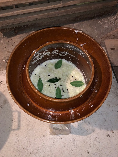 Une couche de chou rapé, une couche de sel, feuilles de laurier, baies de genièvre, une couche de chou, tasser, presser, extraire l'eau du chou, expulser l'air qui oxyde et avarie... sel, chou, sel, chou, ... presser...